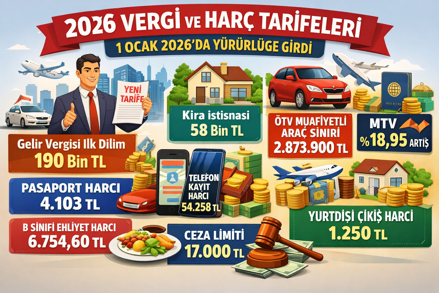 Hazine ve Maliye Bakanlığı tarafından hazırlanan tebliğlerin Resmi Gazete’de yayımlanmasıyla birlikte, 2026 yılında uygulanacak vergi tarifeleri ve harç tutarları resmen yürürlüğe girdi.