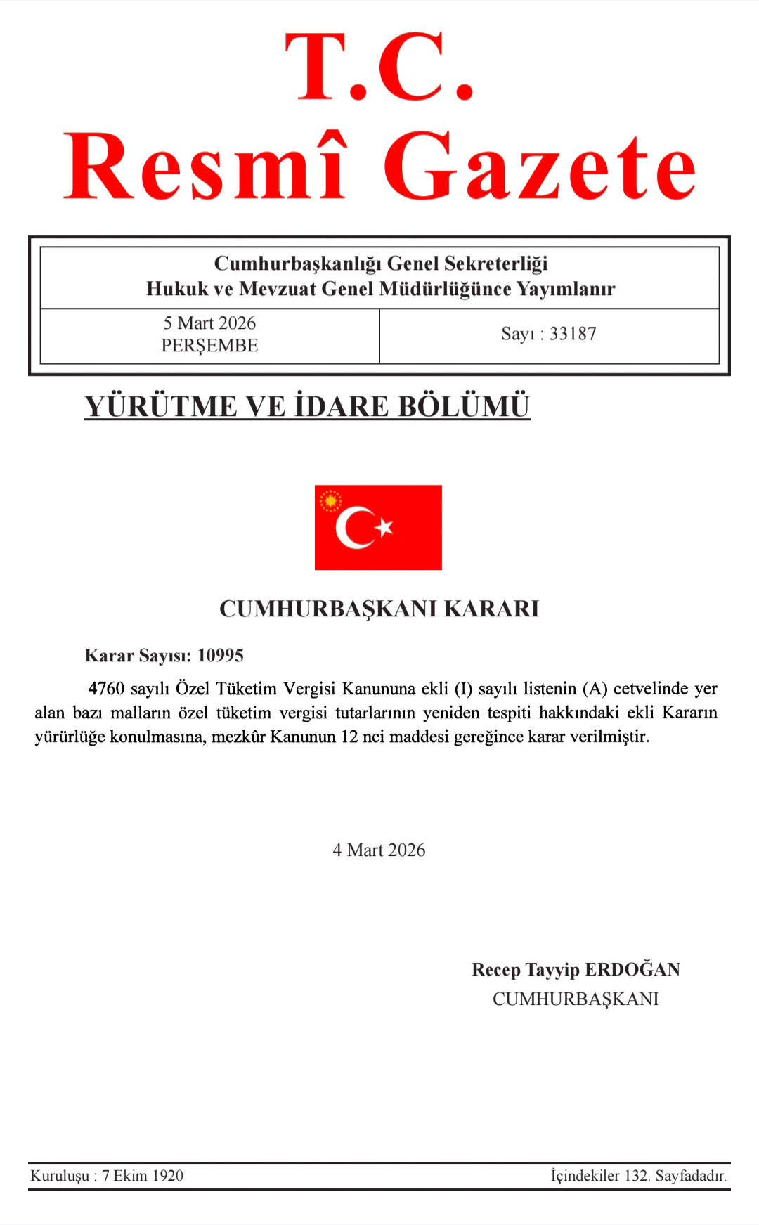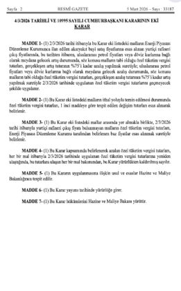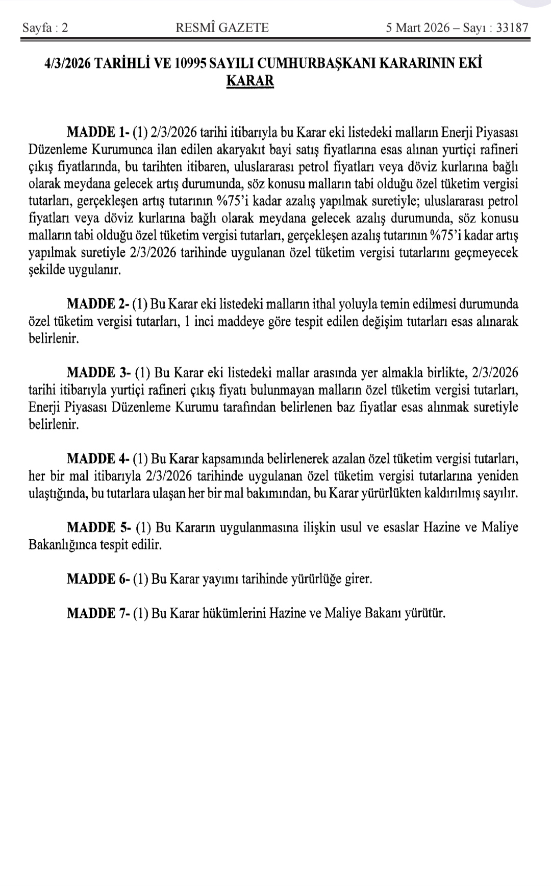 - Resmi Gazete’de yayımlanan kararda şu ifadelere yer verildi: “2/3/2026 tarihi itibarıyla bu Karar eki listedeki malların Enerji Piyasası Düzenleme Kurumunca ilan edilen akaryakıt bayi satış fiyatlarına esas alınan yurtiçi rafineri çıkış fiyatlarında, bu tarihten itibaren, uluslararası petrol fiyatları veya döviz kurlarına bağlı olarak meydana gelecek artış durumunda, söz konusu malların tabi olduğu özel tüketim vergisi tutarları, gerçekleşen artış tutarının %75’i kadar azalış yapılmak suretiyle; uluslararası petrol fiyatları veya döviz kurlarına bağlı olarak meydana gelecek azalış durumunda ise özel tüketim vergisi tutarları, gerçekleşen azalış tutarının %75’i kadar artış yapılmak suretiyle uygulanır.”
