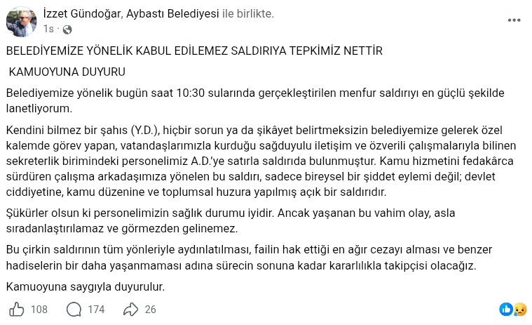 - Başkan İzzet Gündoğar, açıklamasında şu ifadelere yer verdi: “Kamu hizmetini fedakârca sürdüren çalışma arkadaşımıza yönelen bu saldırı, sadece bireysel bir şiddet eylemi değil; devlet ciddiyetine, kamu düzenine ve toplumsal huzura yapılmış açık bir saldırıdır. Şükürler olsun ki personelimizin sağlık durumu iyidir. Ancak yaşanan bu vahim olay, asla sıradanlaştırılamaz ve görmezden gelinemez. Bu çirkin saldırının tüm yönleriyle aydınlatılması, failin hak ettiği en ağır cezayı alması ve benzer hadiselerin bir daha yaşanmaması adına sürecin sonuna kadar kararlılıkla takipçisi olacağız.”