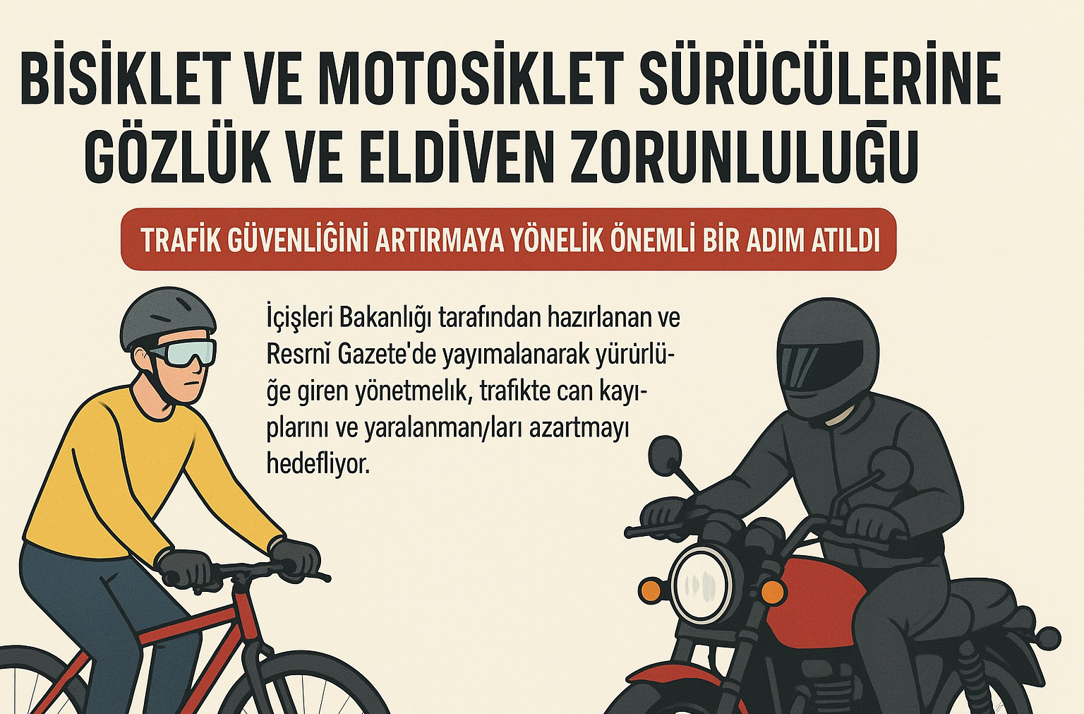 Bisiklet ve Motosiklet Sürücülerine Gözlük ve Eldiven ZorunluluğuTrafik güvenliğini artırmak amacıyla yeni bir düzenleme hayata geçirildi.