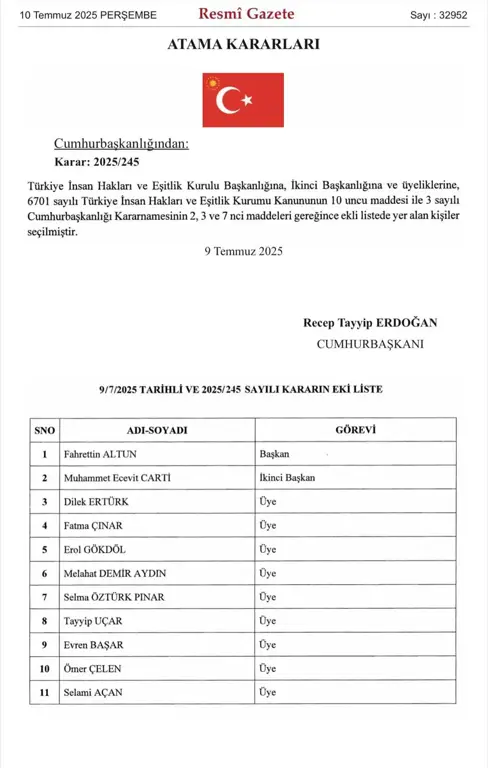 Resmî Gazete’de yayımlanan karara göre Fahrettin Altun, Türkiye İnsan Hakları Eşitlik Kurumu Başkanlığı görevine getirildi.