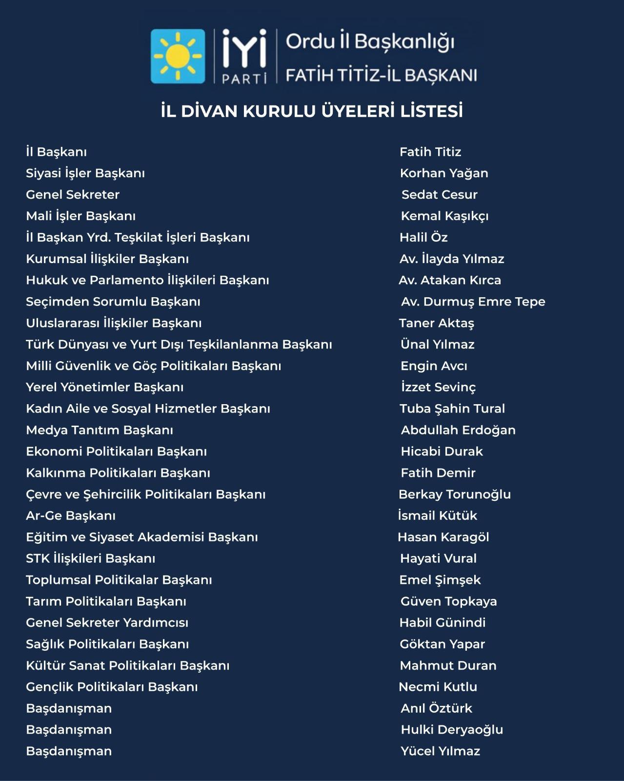 - Yeni yönetimin hem Ordu hem de Türkiye için hayırlı olmasını dileyen Fatih Titiz, açıklamasında şu ifadeleri kullandı:“Güçlü kadromuzun Ordu’da İYİ Parti’yi en iyi şekilde temsil edeceğine olan inancım tamdır. Şimdi yollara düşme vaktidir. Hem yerelde hem de ülke genelinde iktidara ulaşmak için tüm gücümüzle çalışmaya devam edeceğiz. Allah utandırmasın.”