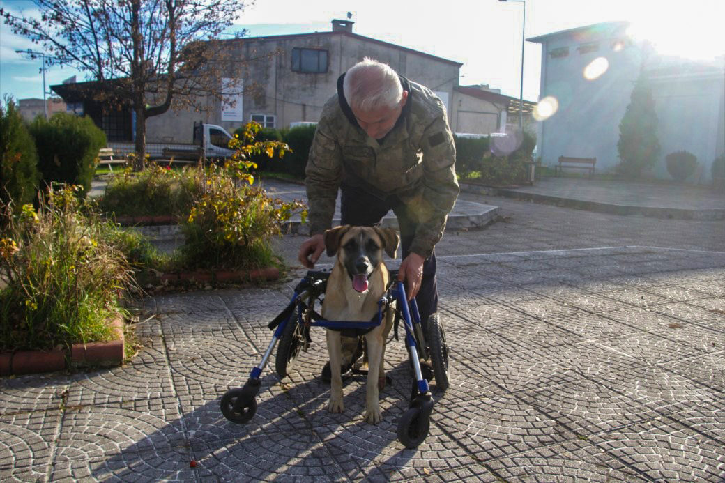 Ordu’da bir oto tamircisi, minibüsün çarpması sonucu omurgası kırılan ve arka bacakları tutmayan köpeğini, yaptırdığı 4 tekerlekli yürüteç ile yeniden hayata bağladı.