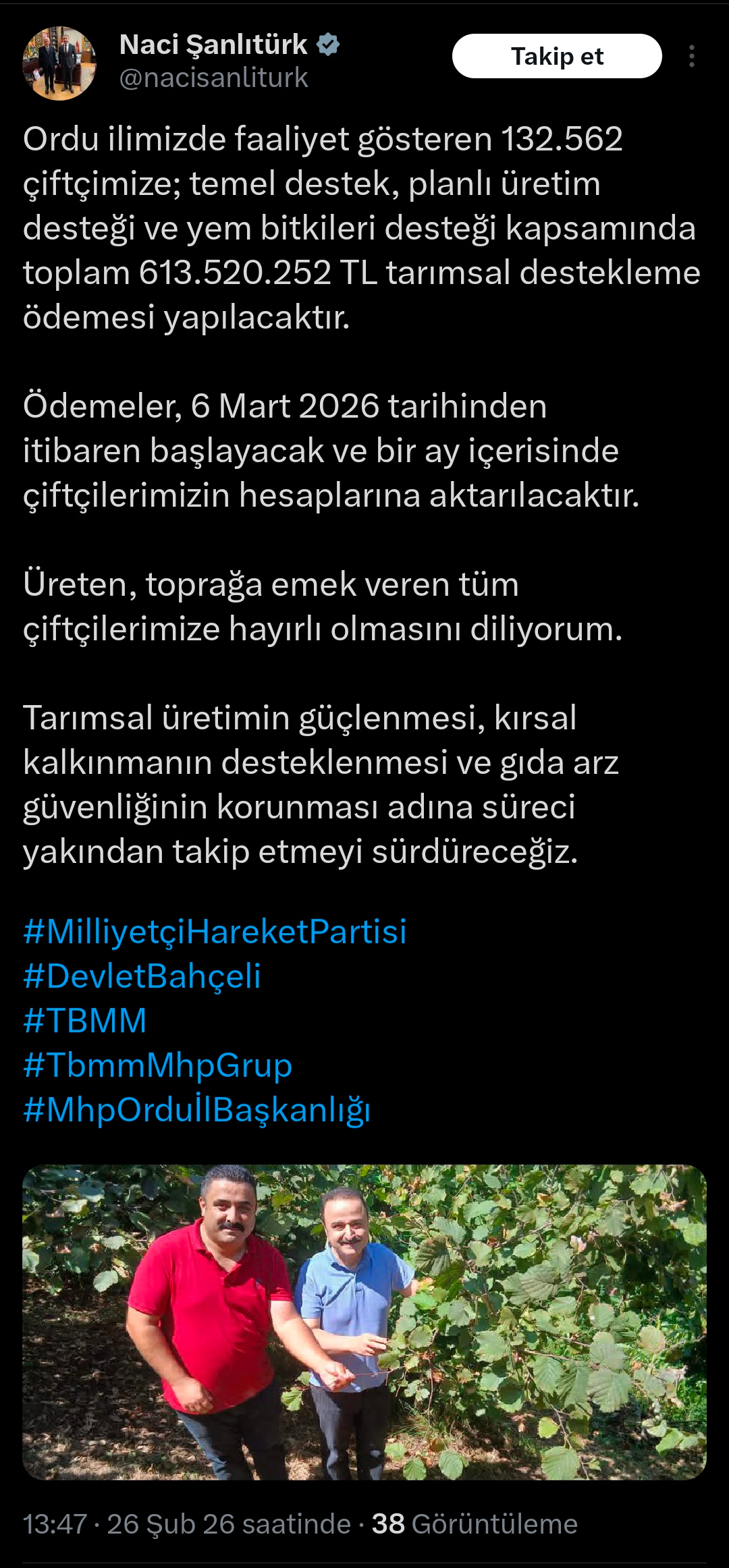 MHP Naci Şanlıtürk, Ordu genelinde faaliyet gösteren 132.562 çiftçiye yönelik toplam 613 milyon 520 bin 252 TL tutarında tarımsal destekleme ödemesi yapılacağını duyurdu.