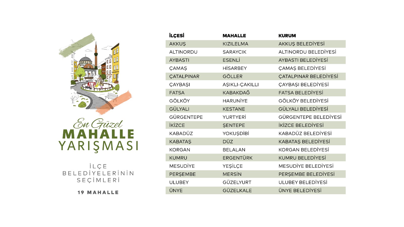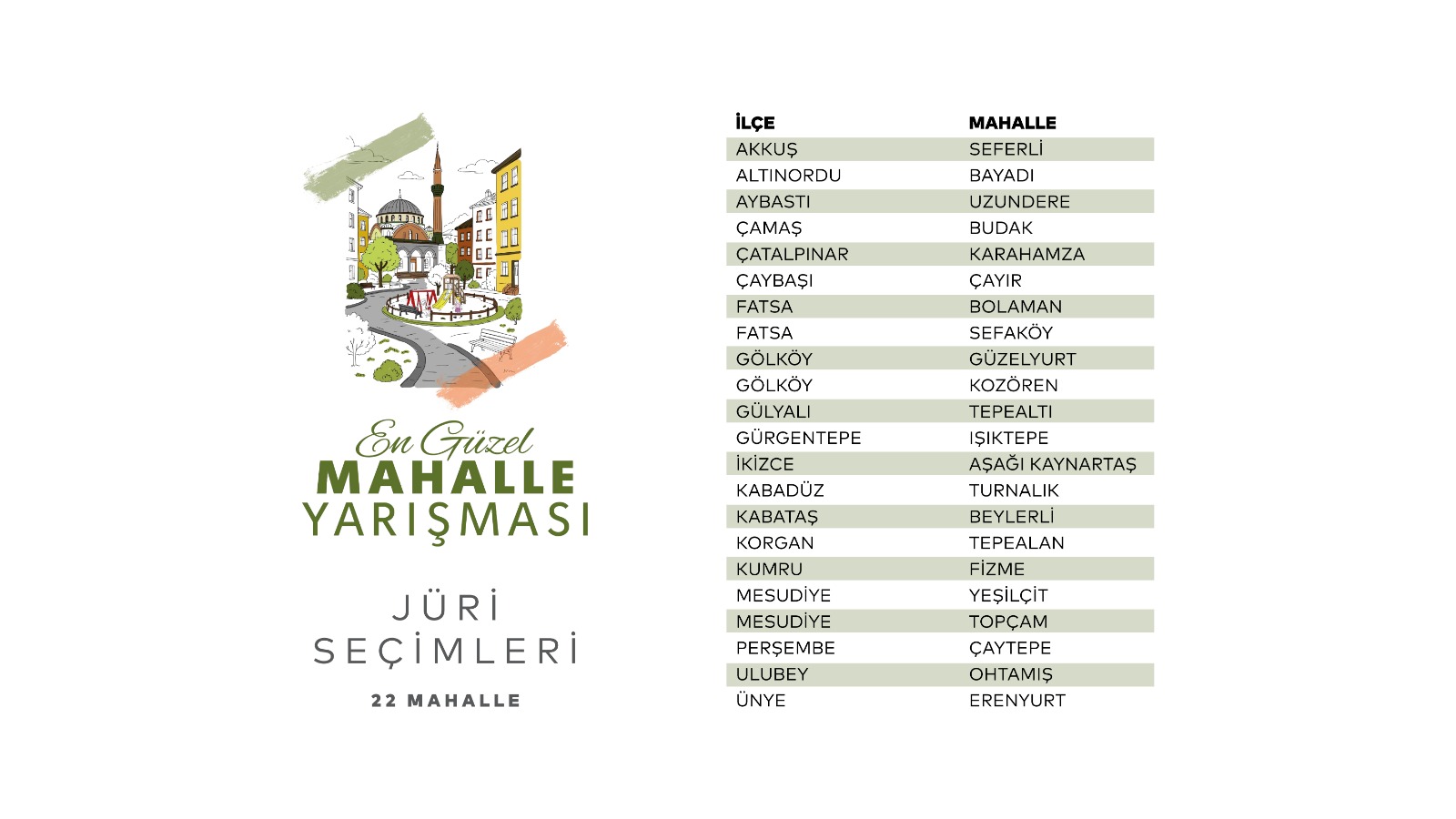 - İlçe ilçe görülmeye değer seçilen mahalleler şu şekilde: “Akkuş Kızılelma ve Seferli, Altınordu Saraycık ve Bayadı, Aybastı Esenli ve Uzundere, Çamaş Hisarbey ve Budak, Çatalpınar Göller ve Karahamza, Çaybaşı Aşıklı-Çakıllı ve Çayır, Fatsa Kabakdağ, Bolaman ve Sefaköy, Gölköy Haruniye, Güzelyurt ve Kozeren, Gülyalı Kestane ve Tepealtı, Gürgentepe Yurtyeri ve Işıktepe, İkizce Şentepe ve Aşağıkaynartaş, Kabadüz Yokuşdibi ve Turnalık, Kabataş Düz ve Beylerli, Korgan Belalan ve Tepealan, Kumru Ergentürk ve Fizme, Mesudiye Yeşilce, Yeşilçit ve Topçam, Perşembe Mersin ve Çaytepe, Ulubey Güzelyurt ve Ohtamış, Ünye Erenyurt ve Güzelkale”