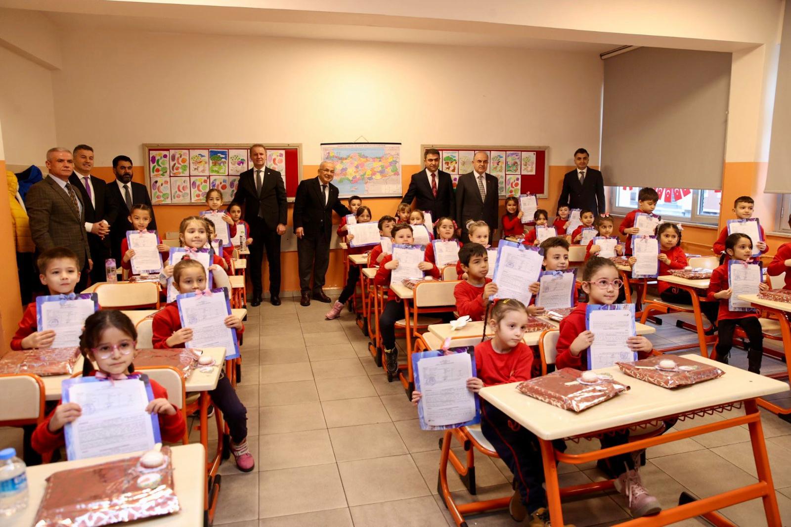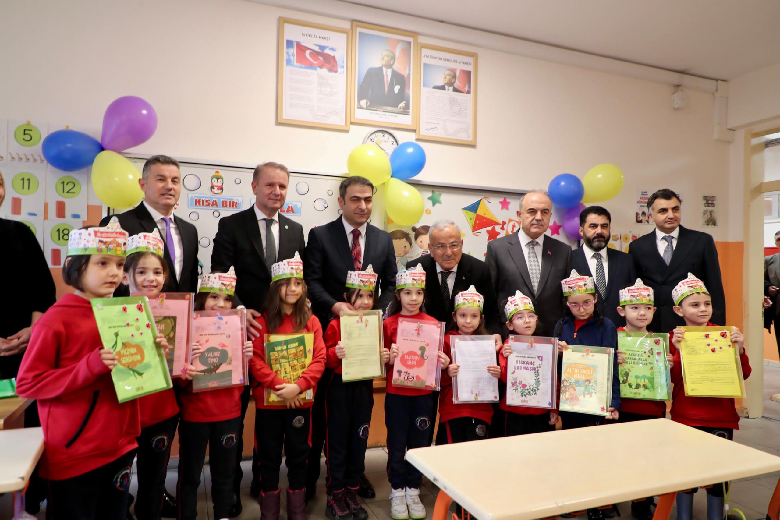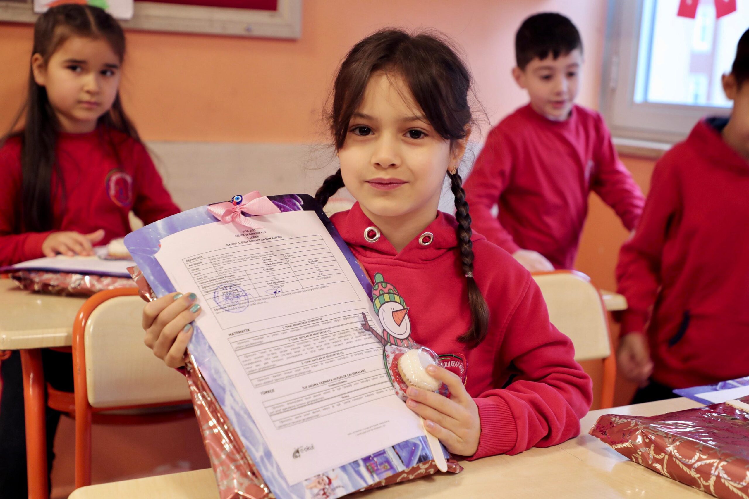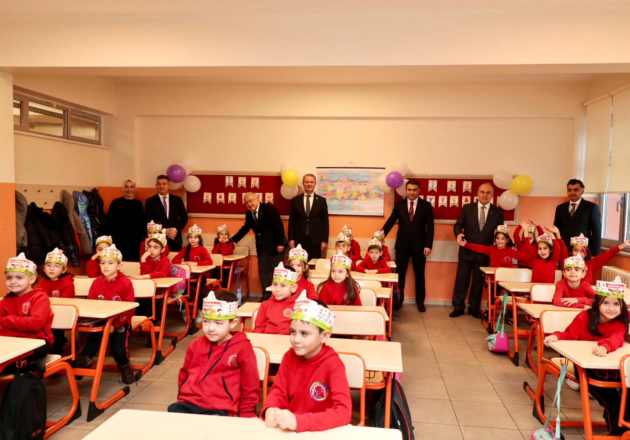 Protokol üyeleri, karne heyecanını paylaşarak öğrencilerle birlikte hatıra fotoğrafı çektirdi. Öğrenciler için ikinci dönem dersleri, 31 Ocak 2025 Cuma günü başlayacak.