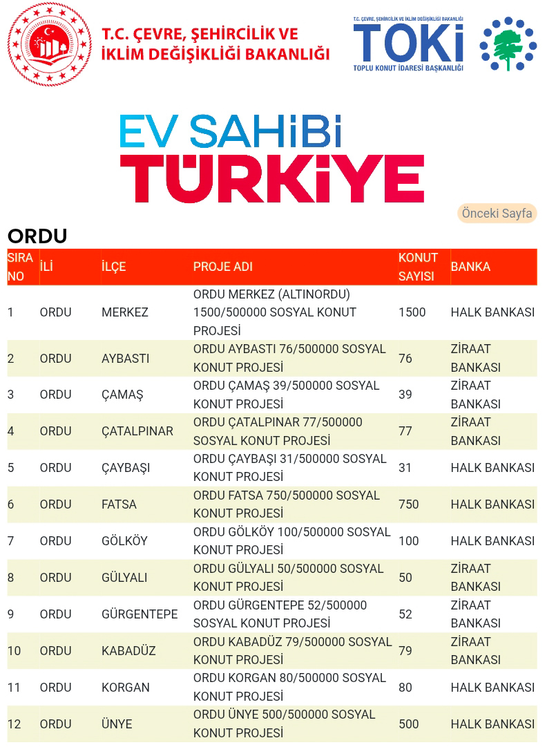 Ordu genelinde toplam 3.334 konut inşa edilecek. En fazla konut Altınordu, Fatsa ve Ünye ilçelerinde yapılacak.