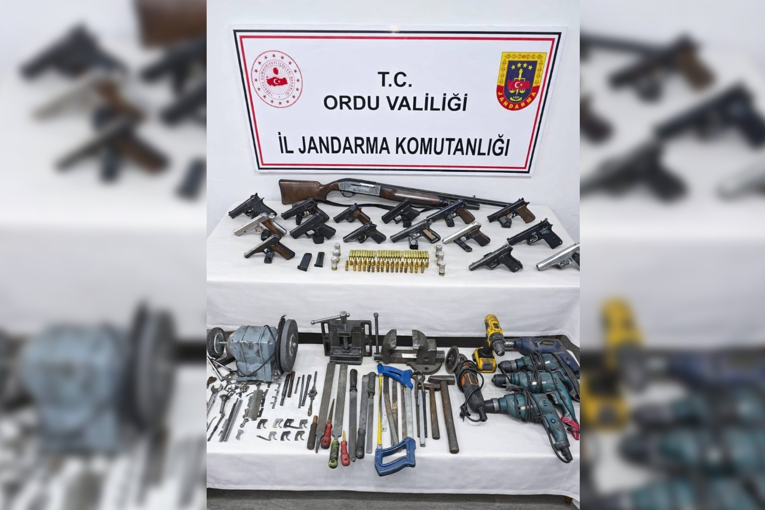 Ünye Cumhuriyet Başsavcılığı koordinesinde şüpheli şahsın ikamet ve eklentilerinde yapılan aramalarda; 15 adet ruhsatsız tabanca, 17 adet tabanca şarjörü, 200 adet tabanca fişeği ve silah imalatında kullanılan çok sayıda malzeme ele geçirildi.