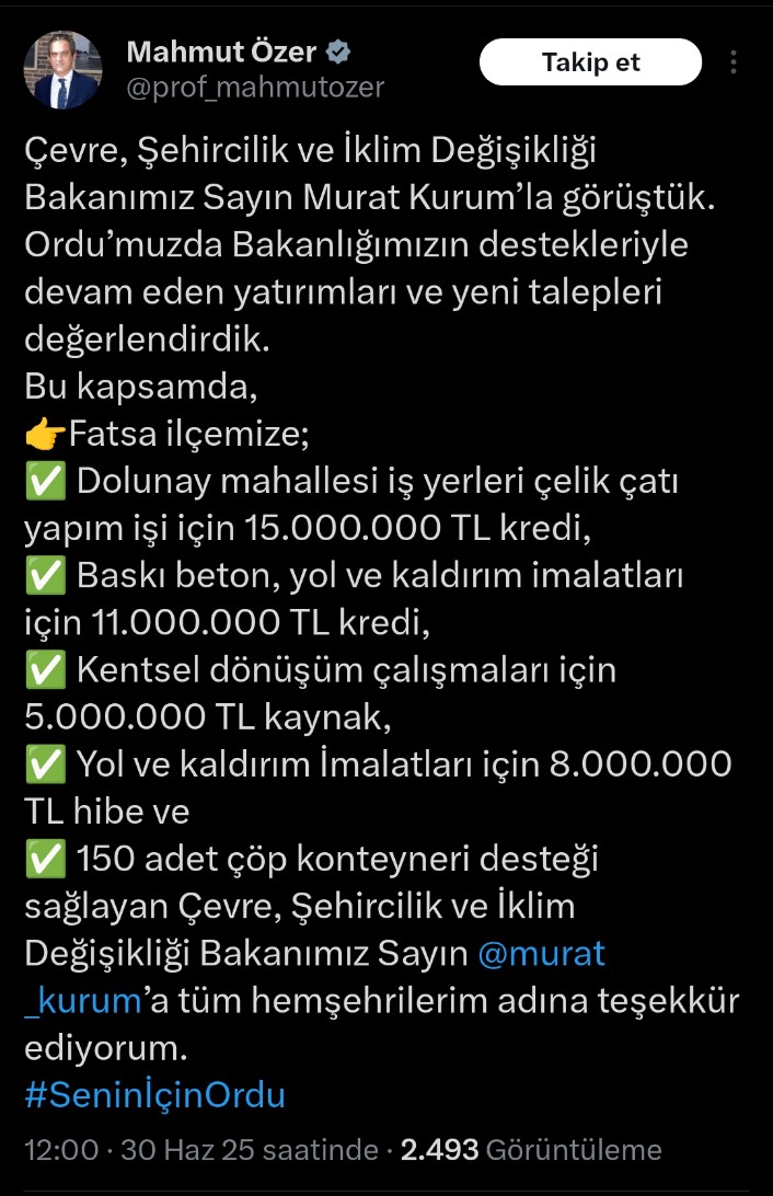 Özer, Çevre Şehircilik ve İklim Değişikliği Bakanı Murat Kurum’a Ordu’ya verdiği desteklerden ötürü teşekkür etti.