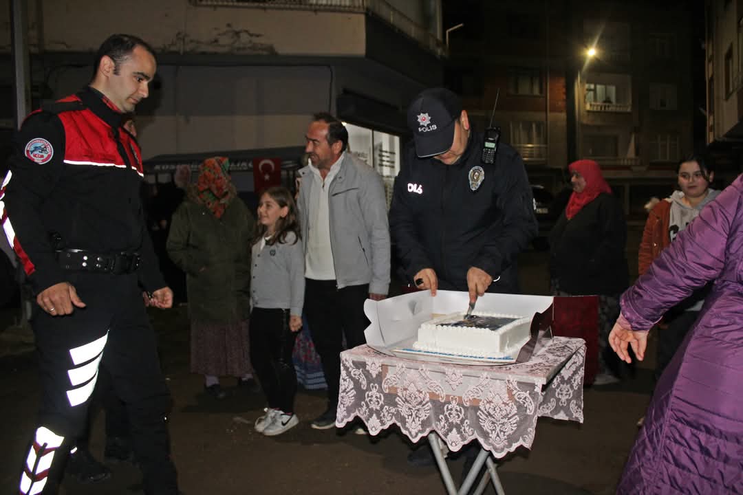 Ordu’nun Ünye ilçesinde bıçak ve silahlı kavga ihbarına giden polis ekiplerini mahalleli pasta sürpriziyle karşıladı.