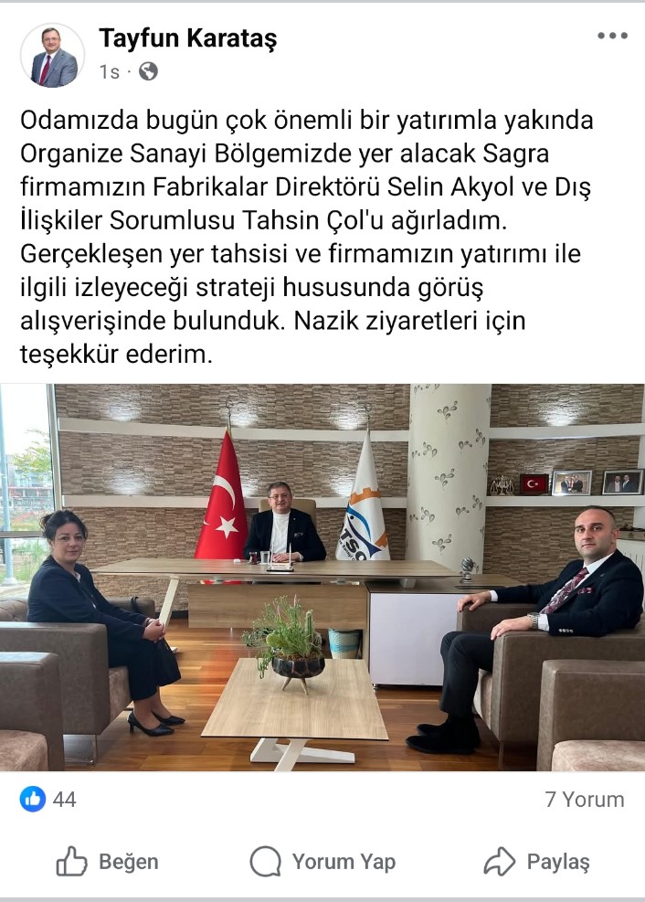 - Fatsa Ticaret ve Sanayi Odası Başkanı Tayfun Karataş, konuyla ilgili yaptığı açıklamada, fabrikanın kısa süre içinde üretim aşamasına geçeceğini belirterek şunları söyledi:“Odamızda bugün, Organize Sanayi Bölgemizde yer alacak olan Sagra firmasının Fabrikalar Direktörü Selin Akyol ve Dış İlişkiler Sorumlusu Tahsin Çol’u ağırladık. Gerçekleşen yer tahsisi ve firmanın yatırım stratejisi hakkında verimli bir görüşme gerçekleştirdik. Nazik ziyaretleri için kendilerine teşekkür ediyorum.”