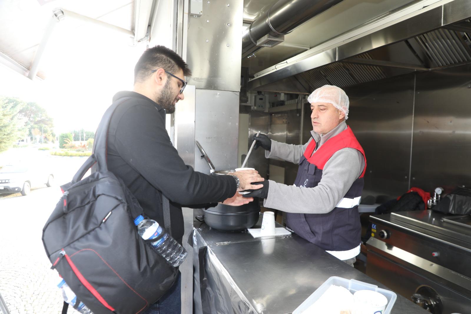 Üniversite girişine konuşlandırılan mobil mutfak tırında, Buharalı Şakir Efendi Aşevi’nde pişirilen taze çorbalar; sabah saatlerinde derse giden veya ders arasında mola vermek isteyen öğrencilerin hem içini ısıtıyor hem de karınlarını doyuruyor.